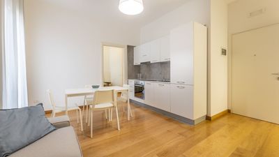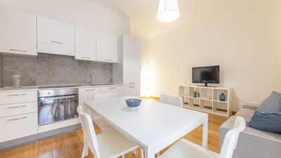 The apartment, accessible by both elevator and stairs, consists of a double bedroom with air conditioning, a living room with a dining table and chairs, a comfortable sofa, a kitchenette, and a bathroom with a shower stall. Additionally, the apartment features a reserved parking space, a dishwasher, an electric stove, a washing machine, air conditioning in both rooms, and free Wi-Fi.