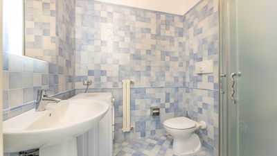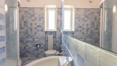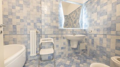 The apartment, served by an elevator and stairs, is spread over two floors. On the ground floor, there is a living room with a dining table and chairs, a comfortable sofa, a kitchenette, a bathroom with a shower, and an outdoor space equipped with garden furniture. On the first floor, there are two double bedrooms and two bathrooms, one with a shower and the other with a bathtub. The apartment also offers a reserved parking space on the -1 floor with direct access to the apartment, a dishwasher, an electric stove, a washing machine, air conditioning in all rooms, and free Wi-Fi internet access.