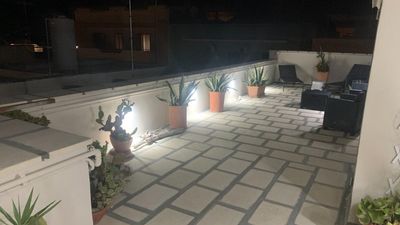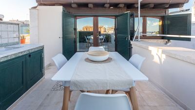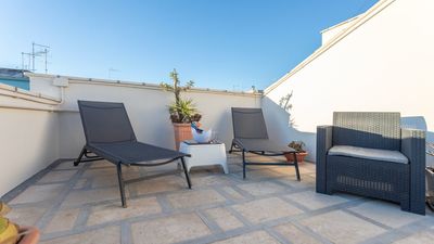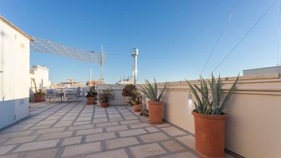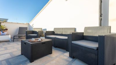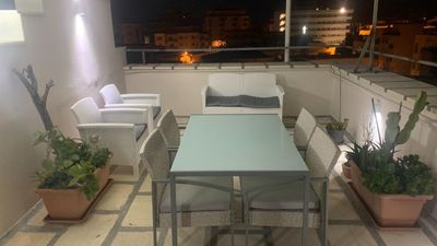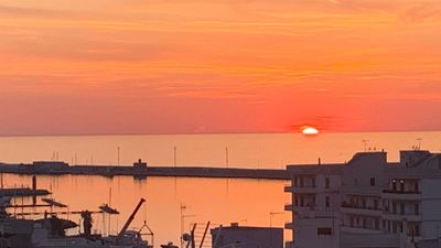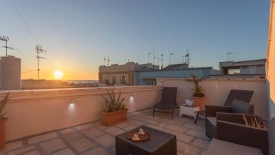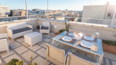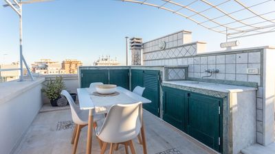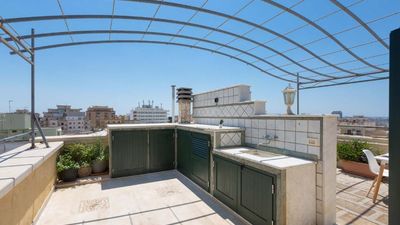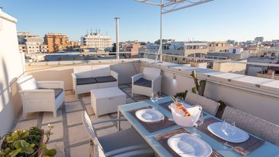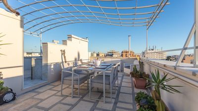 Outside, a beautifully maintained and elegant penthouse features a stunning and spacious terrace equipped with table, chairs, barbecue, outdoor shower, and comfortable sofas — perfect for relaxing while enjoying an amazing view over the entire city and the wonderful sea, with truly unique sunsets.